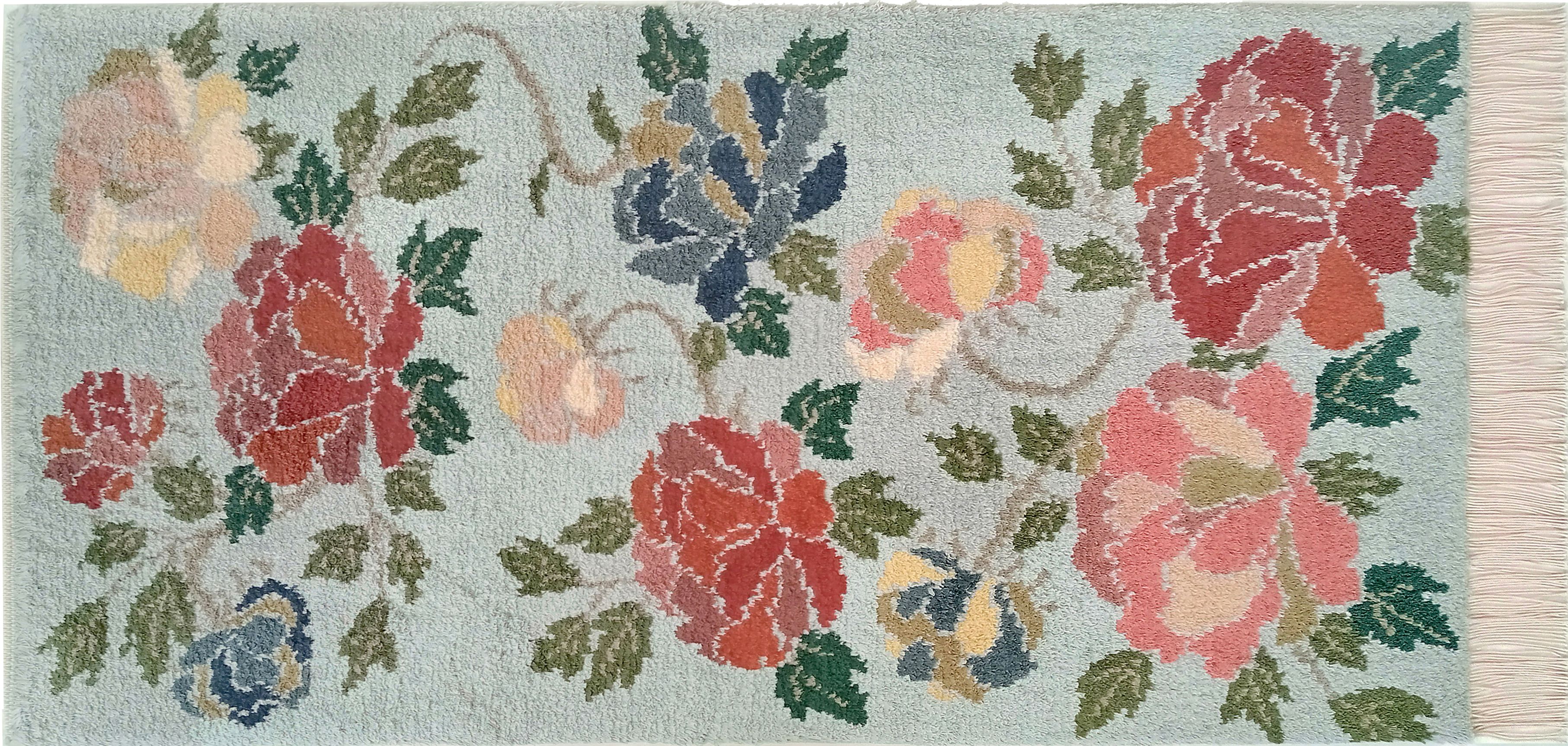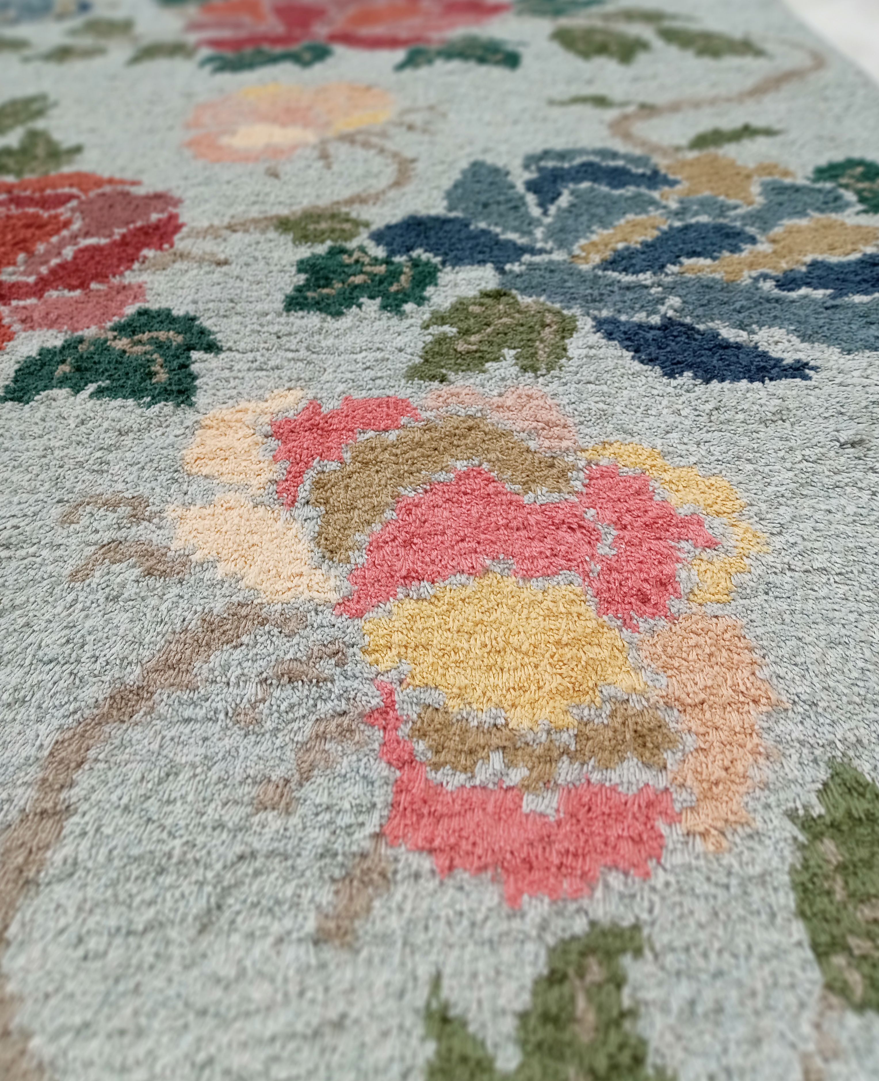 第60回西部伝統工芸展で本家鍋島緞通 四代目 吉島ひろ子作品「華牡丹」の入選発表がありました。 艶やかな牡丹の花を鍋島緞通にした作品です。 サイズ80×160㎝ 織り毛の長さは揃えず、ふわっとした感じに仕上げました。